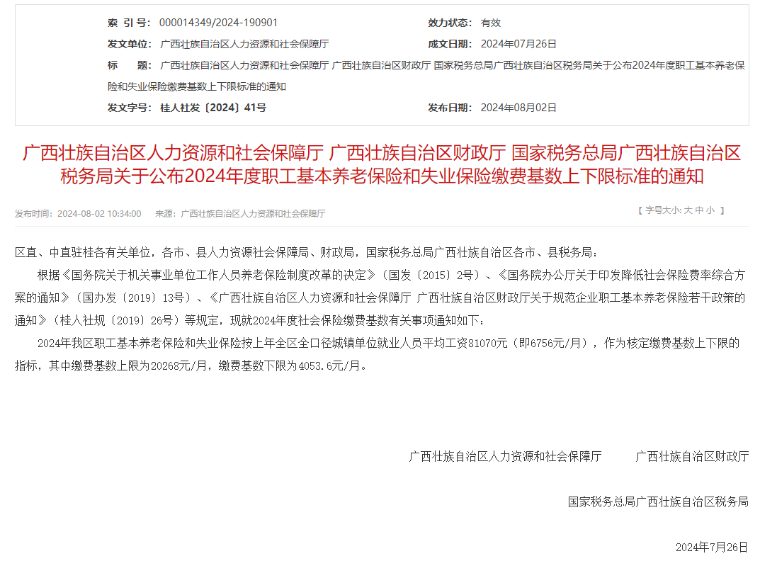 2024年广西壮族自治区职工基本养老保险和失业保险按上年全区全口径城镇单位就业人员平均工资81070元(即6756元/月),作为核定缴费基数上下限的指标,其中缴费基数:
